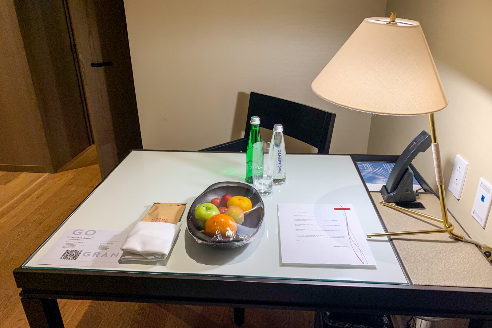 When I got to my corner room on the seventh floor, I realized I had not only been upgraded to a nicer room, but that it was a spacious one-bedroom suite. Upon entering, I noticed a welcome letter, a tray of fresh fruit and some water waiting for me on a table in the living room.