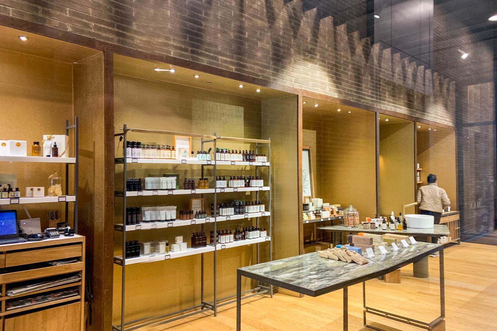 My favorite part of the main space, though, was the dramatic entryway, which had see-though shelves sporting a collection of local books and art.