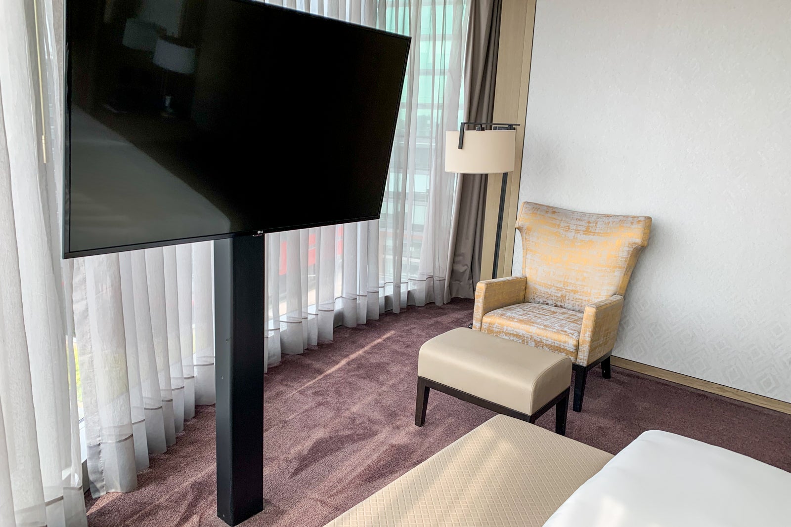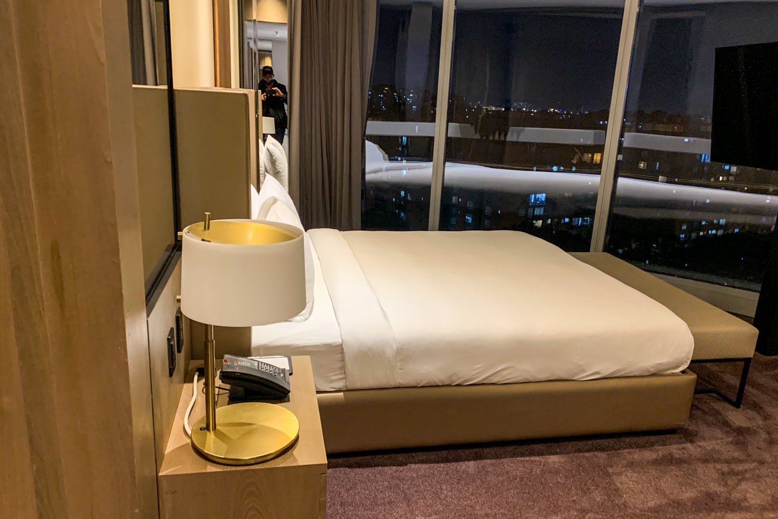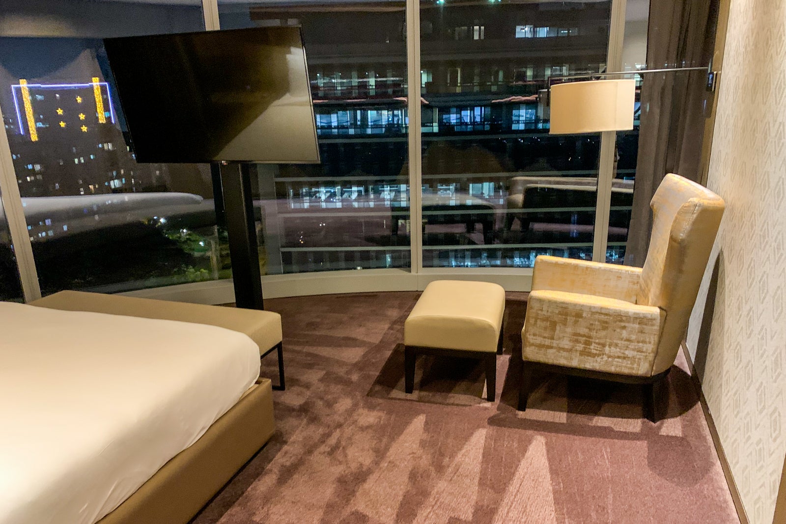 Designed around the curved shape of the building, the bedroom featured a king-size bed opposite a series of windows and a large flat-screen TV mounted to the carpeted floor. The bed itself was quite comfortable, offering four plush pillows and sparkling clean sheets.