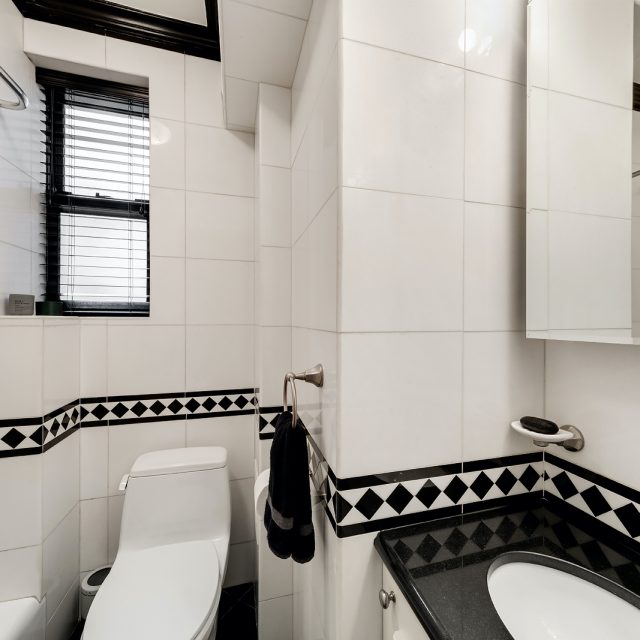 All the way on the other end of the apartment–perfect for privacy–are two more large bedrooms, one with an en-suite bathroom. Off the hallway are another full bath and a full-sized washer and dryer. Across the hall is a well-outfitted home office with a built-in desk.