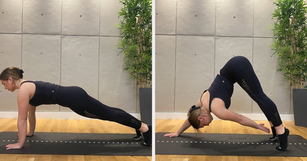 Take a breath out as you drive the hips up to the ceiling, pushing through the right palm as the left arm extends to the right foot, crossing the centre of the body. You should feel the scoop through the abdominals as you lift the hips up. Breathe in as you come back to plank. Work through this movement alternating arms for one minute.