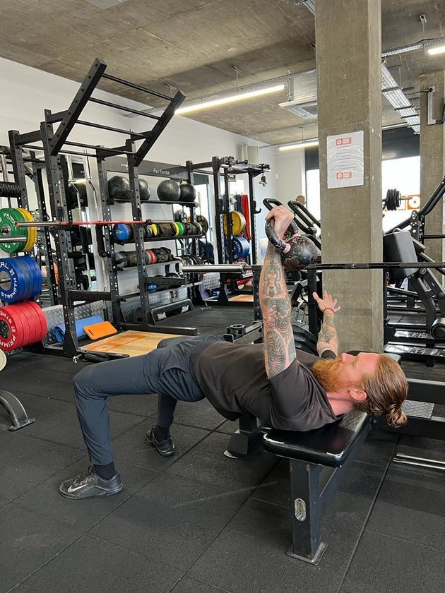 Set your upper back on a bench or stable object, keep your hips fully extended towards ceiling, engage your glutes and place the bell in the hook of your thumb behind your hand. Keep your opposing arm free from the body to challenge the core to stabilise you throughout, now press the bell directly up over chest whilst keeping the elbow approximately 45 degrees from the shoulder. Slowly reset the movement so elbow is level with torso and go again. Once you’ve achieved your rep range, swap arms and go again. This movement gives a lot of bang for its buck:posterior chain engagement, core stability and unilateral pectoral strength.