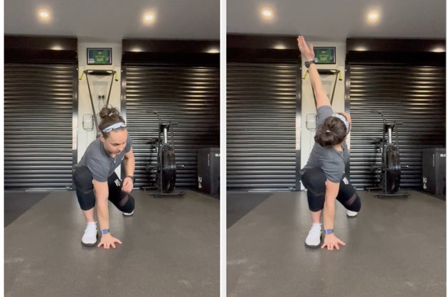 The workout starts with a move she’s named ‘the world’s greatest stretch’.