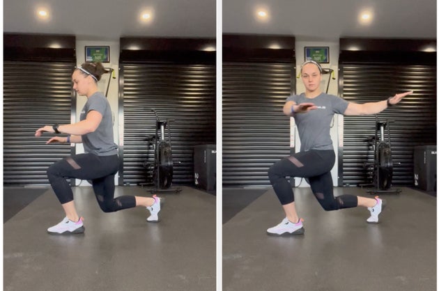 “The 3 minute AMRAP has midline, lower and upper body for a quick total body hit for a perfect start to your day,” McQuaid says. “I find lunges amazing to get your glutes firing, especially if you have a desk job, with the rotation also activating the core.”