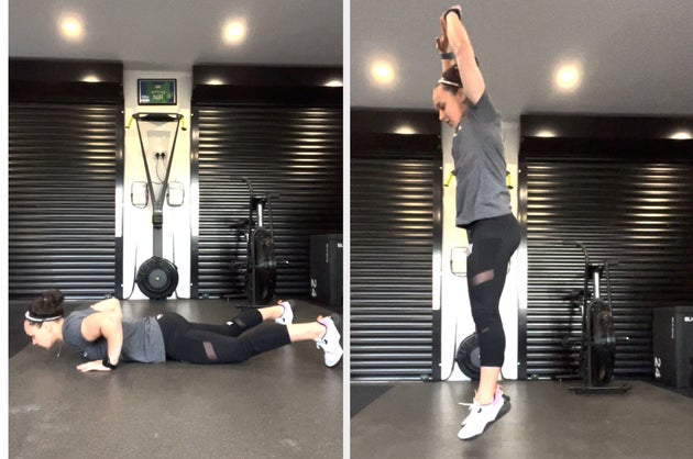 Jump or step back up to standing and perform a little jump so both feet come off of the floor whilst tapping both hands together behind your head.