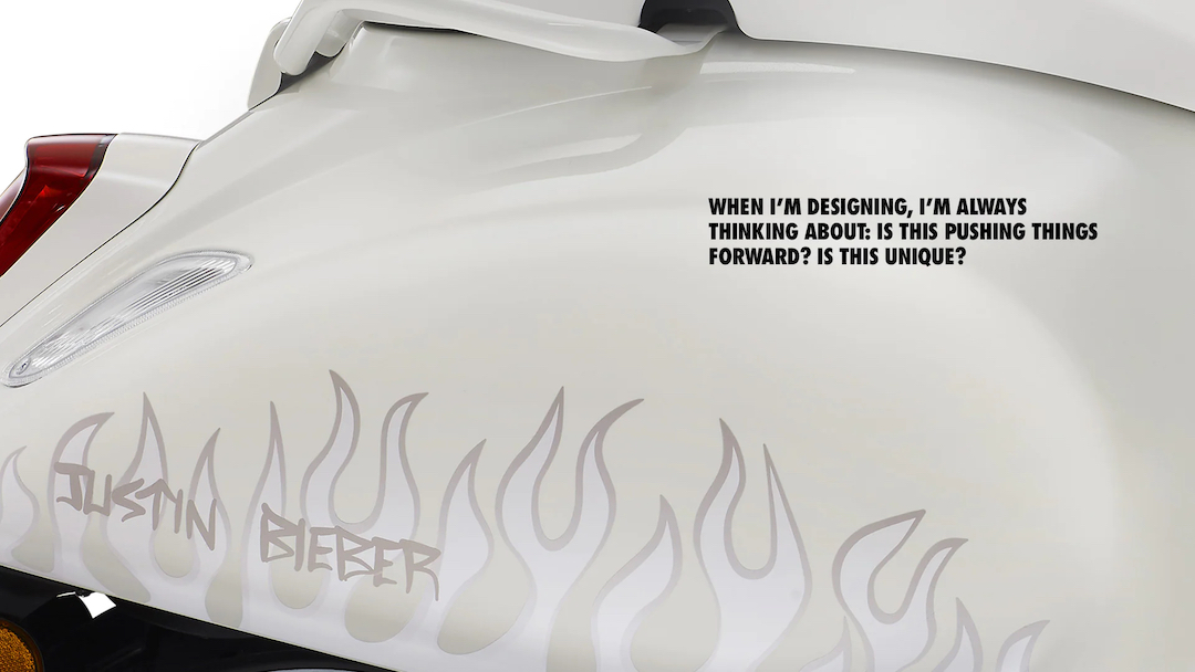 Choosing a monochromatic white—with flame decals for extra oomph—Bieber had a hand in selecting all of the scooter’s nooks and crannies, from the saddle down to the spokes of the rims.